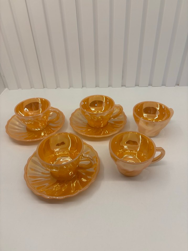 Parlak yüzeye sahip bej renkli seramik fincan takımı 2 tanesının tabağı yoktur resımdede gördüğünüz gıbı 5 adete fıncan takımı sadece 2 tanesının tabağı yoktur onun dışında Herhangı bı sorunu yoktur