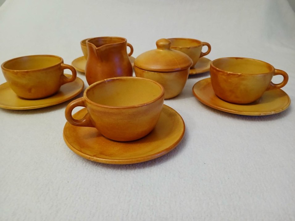 Bej tonlarında seramik çay fincanları, tabakları, kapaklı şekerlik ve sürahi içeren set.