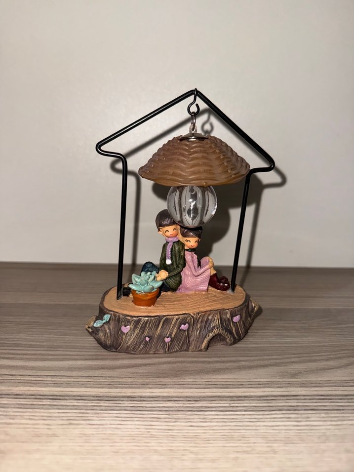 Bej renkli, küçük bir çatının altında sırt sırta oturmuş çocuk figürleri ve saksıda bitki detayları olan biblo.