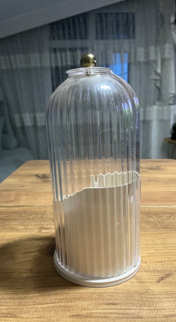 Bej renkli mum, üzerinde altın renkli düğmeli, kabartmalı cam kapak içinde yer alıyor. Yumuşak ışık efekti sağlar. ️