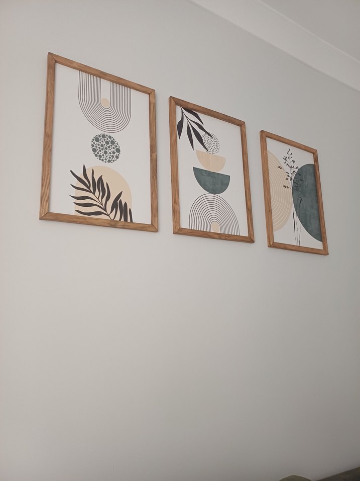 Üçlü tablo seti, ahşap çerçeveli bej renkli soyut desenler ve doğal motifler içerir. 35*50 ölçüleri