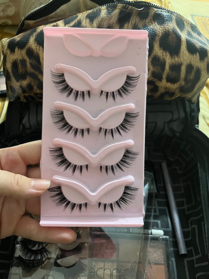 Doğal görünümlü, bej renkte dört adet takma kirpik seti. Pembe kutusunda kolay saklama imkanı sağlar.
