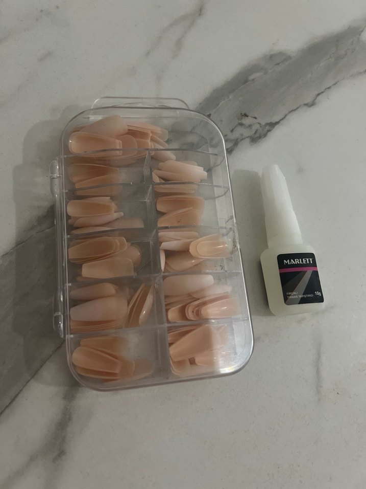 Bej renkli farklı boyutlarda takma tırnaklar, kolay uygulama için küçük yapıştırıcı şişesiyle birlikte. Şeffaf kutuda düzenli şekilde saklanır.
