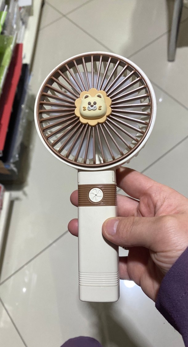 Bej renkli taşınabilir el vantilatörü, sevimli aslan figürü ve kolay kullanım için basit kontrol düğmesi içerir. Hafif serinlik sağlar.