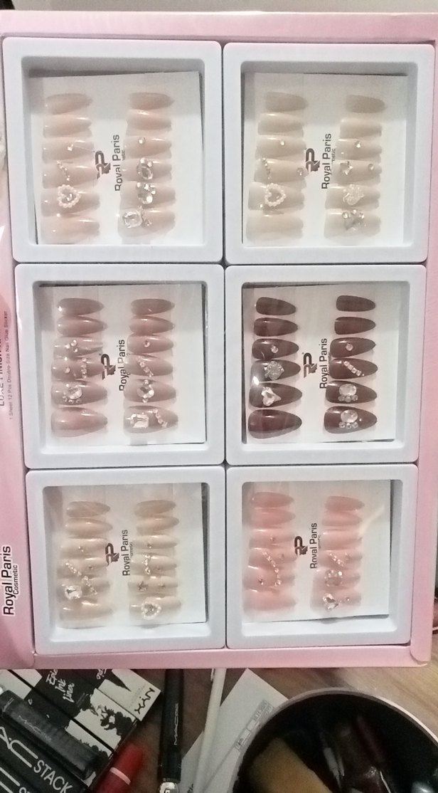 Bej renkte, açık tonlarda taşlı ve çiçek desenli tırnak süslemeleri. Farklı tırnaklar için çeşitli modeller içerir. "M" işaretlidir.