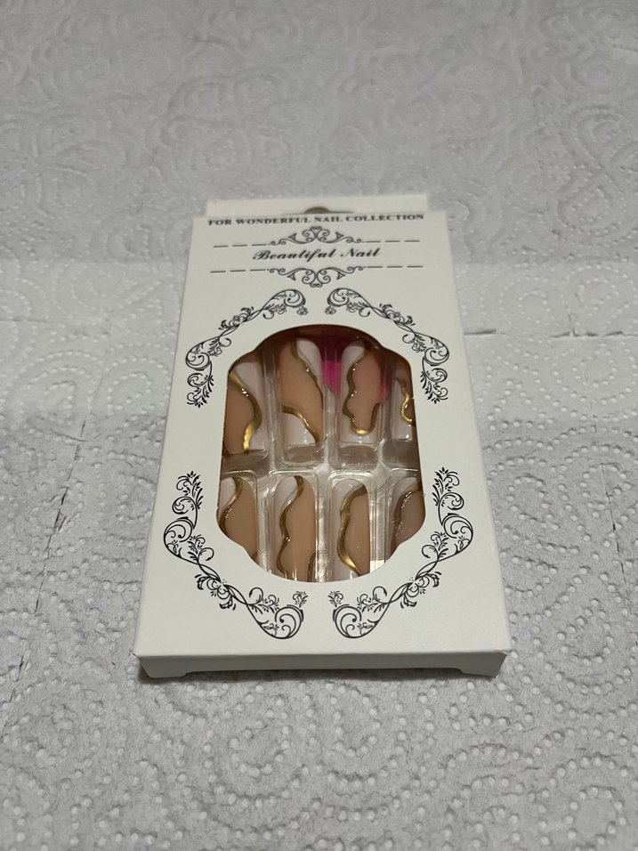 Bej renkte, açık tonlu ve şık altın detaylara sahip tırnak süslemeleri seti. Farklı boyutlarda çeşitli parçalar içerir. ✨24 adet tırnak 24 adet yapıştırıcı bir adet törpü