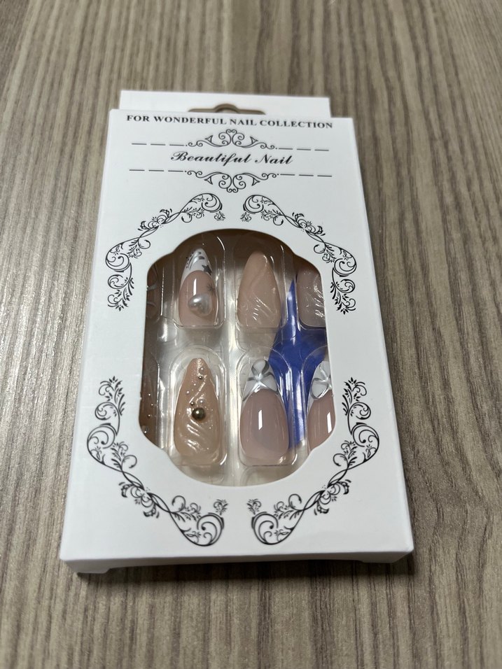 Bej renkli, açık tonlarda dekoratif detaylara sahip yapay tırnaklar ve küçük uygulama aparatı içerir. 24 adet tırnak 24 adet yapıştırıcı bir adet Törpü