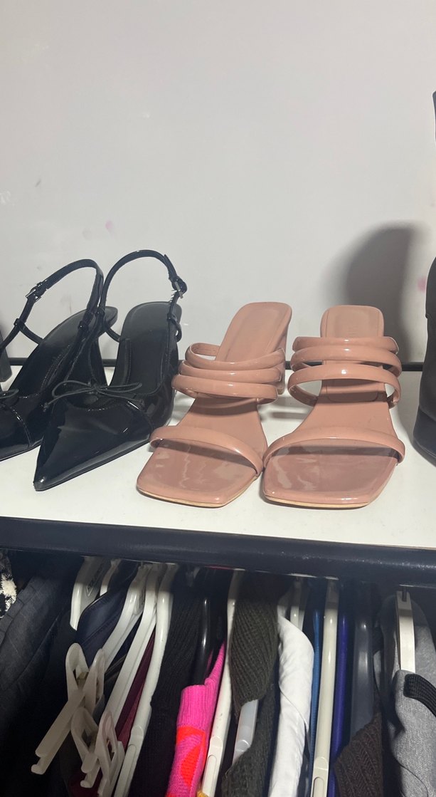 Bej renkli, tokalı bantlara sahip stiletto topuklu kadın sandaletleri. Minimalist ve çağdaş tasarıma sahip, günlük kullanım için uygun.