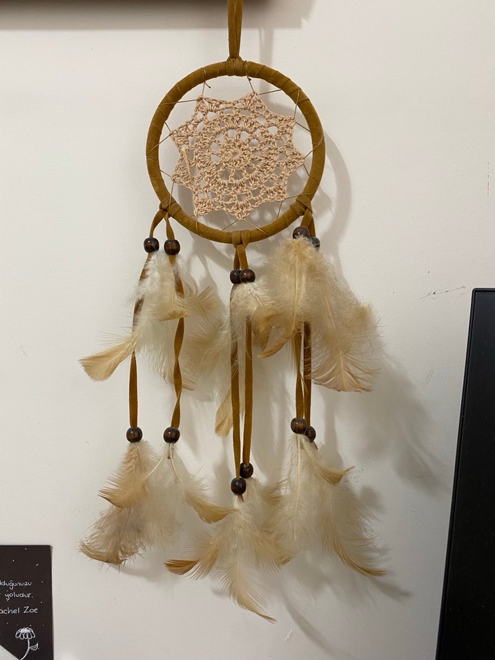 Bej renkli, tüylerle süslenmiş ve ortası örgü detaylı, doğal görünümlü ahşap boncuklu rüya kapanı.