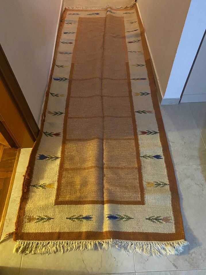 Urfadan alınmıştır. 2,75/100 cm ölçülerindedir. Bej renkte, geleneksel tarzda, desensiz ve açık tonlarda bir kilimdir. Kenarlarında püsküller bulunur ve sade bir görünüm sunar. Bir kenarında bir açılma vardır.Makinada yıkanmıştır bir kere, açılmalar makinede sıkışmaktan olmuş diye düşündük.