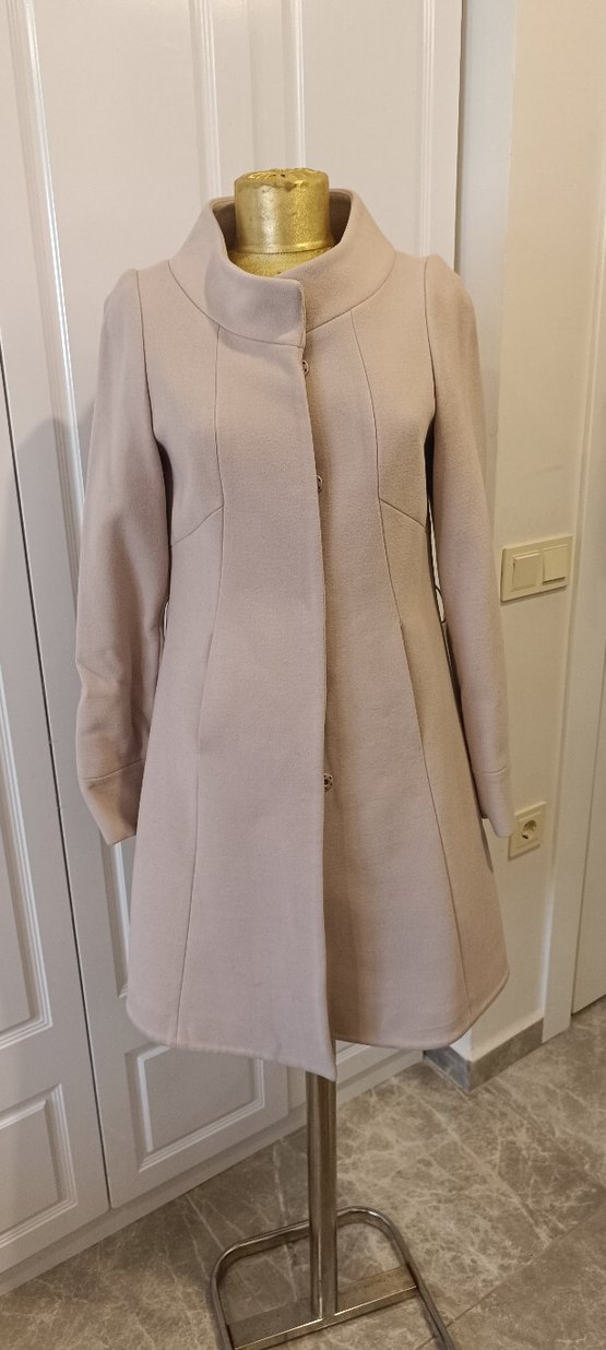 Bej renkli uzun kaban, yüksek yakalı ve düz hatlara sahip. Gizli düğmeli kapama ve uzun kollu tasarımıyla şık bir görünüm sunar.