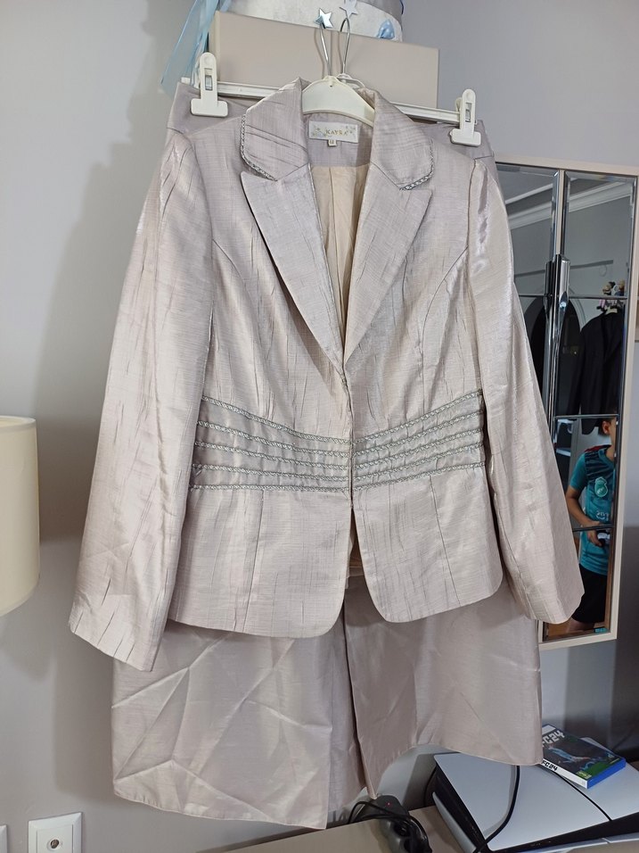 Bej renkte, uzun ve regular fit kesime sahip kadın takımı. İpek gibi kumaştan, modern klasik tarzda, düğmeli ve askılı kollarla ofis için uygun.KAYRA MARKA 44 BEDEN 1 KEZ GIYDI ANNEM