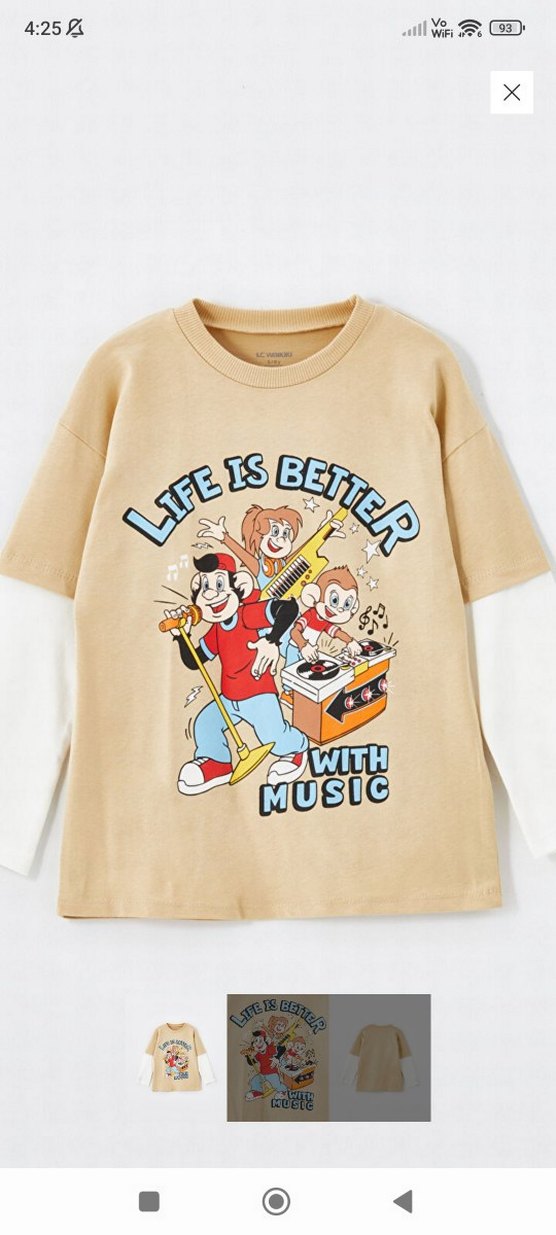 Bej renkli uzun kollu erkek tişörtü, bol kesim ve renkli baskılı müzik temasıyla dikkat çekiyor. Bisiklet yaka ve katmanlı görünüm sunar, sokak tarzı rock punk havası yaratır.