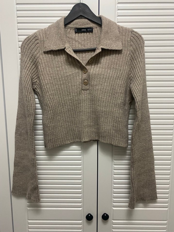 Bej renkli, uzun kollu, yakalı ve düğmeli triko kazak. Rahat ve şık günlük kullanım için uygundur.