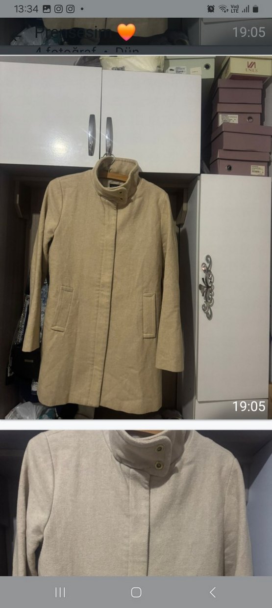 Bej renkte, yarım dik yaka, gizli düğmeli ve iki yan cepli kaban. Soğuk havalar için uygun, pürüzsüz dokulu bir ürün.
