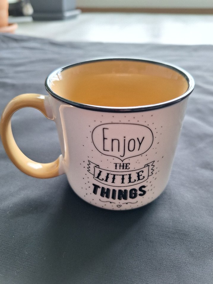 Renkli iç yüzeye ve üzerinde 'Enjoy the little things' yazısı bulunan bej seramik kupa. Sıcak içecekler için uygun ☕.