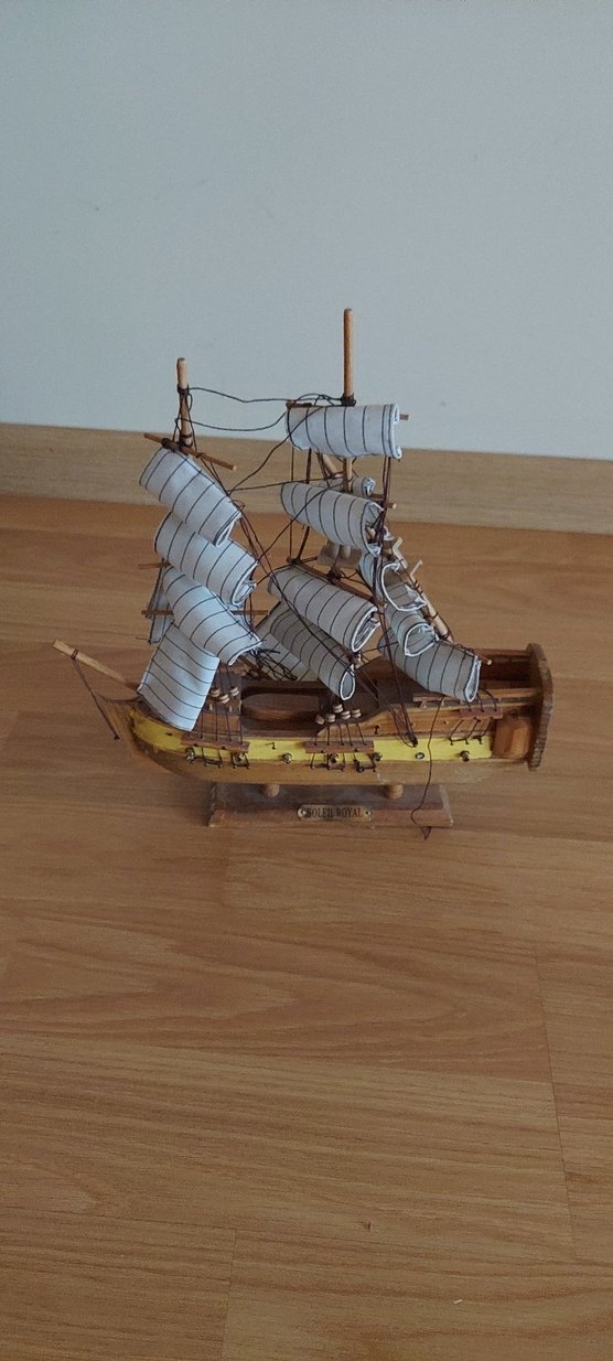 Detaylı yelken ve halatlarıyla bej renkli yelkenli gemi figürin, küçük bir taban üzerinde sergilenmeye uygundur. ⛵
