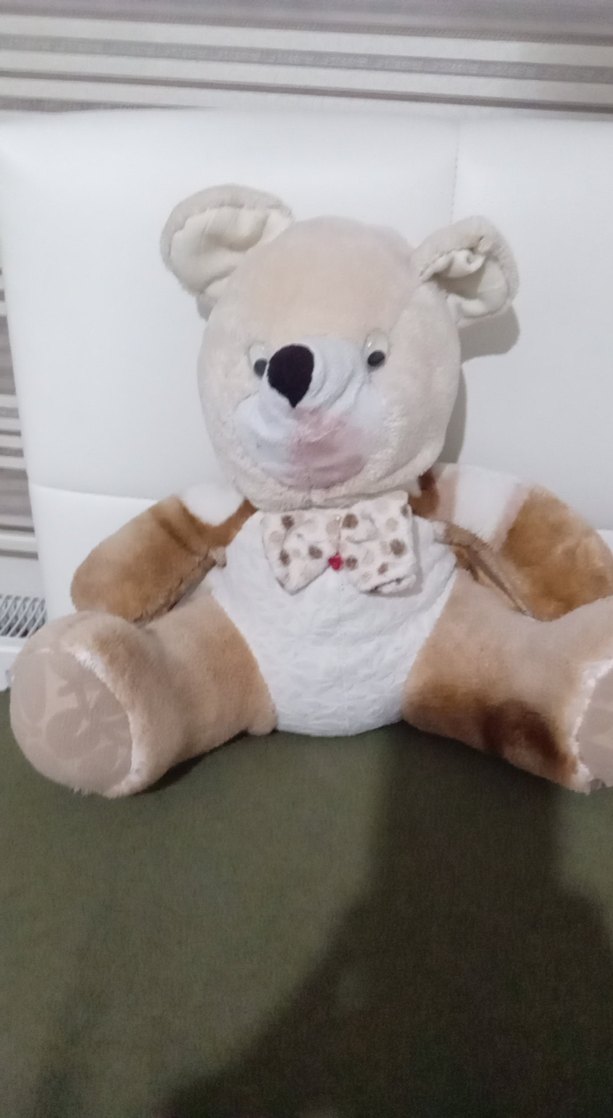Yumuşak kumaştan yapılmış, bej renkli peluş ayıcık, dekoratif papyon detayıyla sevimli bir oyuncaktır. 45 cm