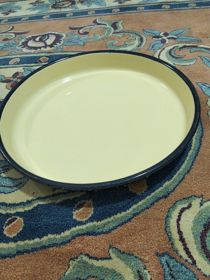 Düz yüzeyli, koyu kenarlı bej renkli yuvarlak tepsi, servis veya düzenleme için uygundur. ️