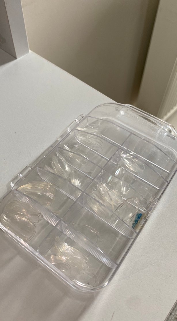 Şeffaf plastik kutuda düzenlenmiş bej renkte takma tırnak seti, tırnak süslemesi için uygundur. Karışık
