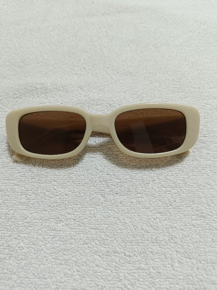 Bej renkli, dikdörtgen çerçeveli güneş gözlüğü, minimalist tasarım ve pastel tonlarla retro ve zahmetsiz şıklık sunar. Bohem ve hippie stiller için uygun.