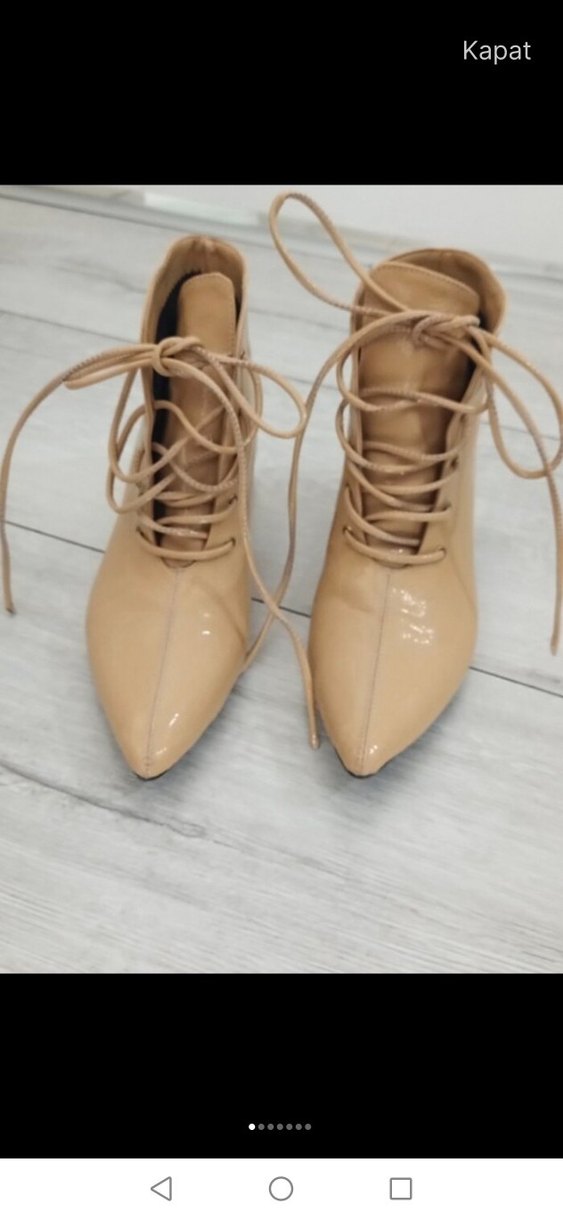 Bej rugan malzemeden üretilmiş, bağcıklı ve ince topuklu kadın botu. 5 cm topuk sorunu yoktur ı love Shoes marka