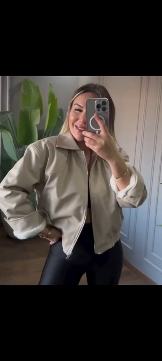 Bej rugan deri, yakalı ve uzun kollu, bol kesim, normal boyda kadın ceket. Günlük kullanım için uygun, rahat sokak stili ceket.