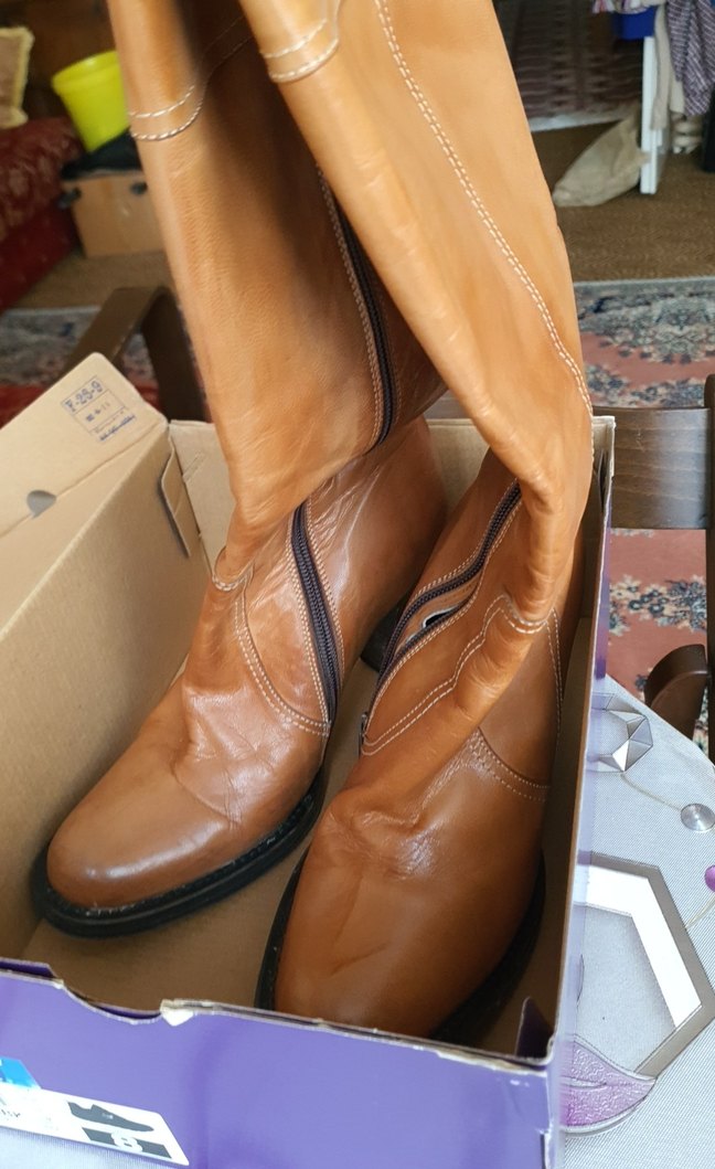Bej rugan deri diz boyu kadın çizmesi, dolgu topuklu ve yan fermuarlı, klasik tasarıma sahip, günlük kullanıma uygun.