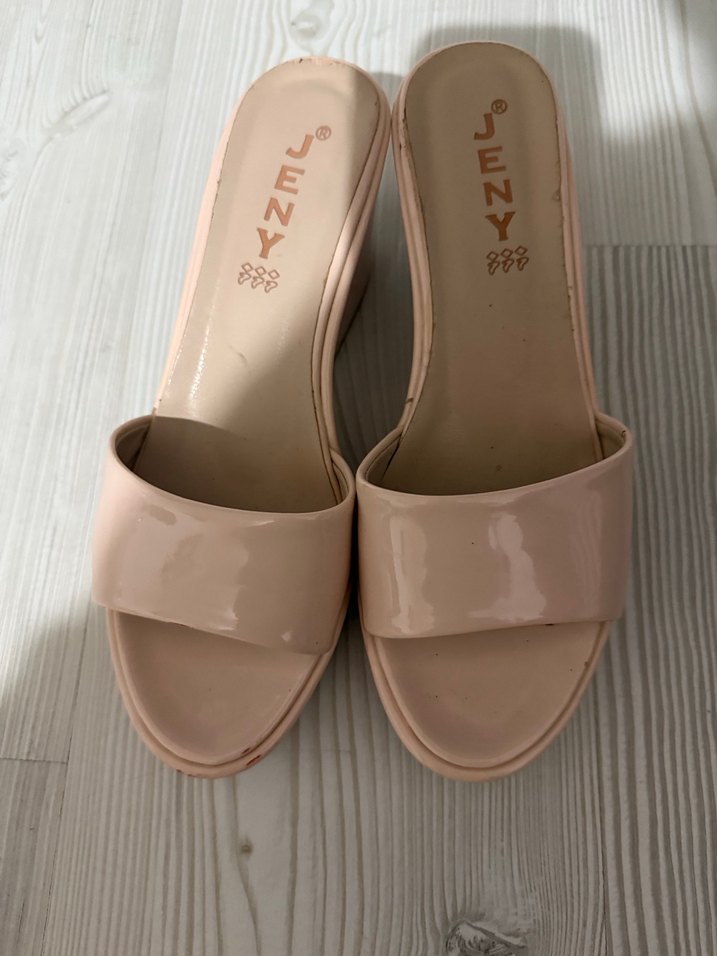 Bej renkli, rugan görünümlü kauçuk malzemeden yapılmış kadın dolgu topuk terlik, minimalist ve desensiz tasarıma sahiptir. 39 numara hiç kullanılmamıştır