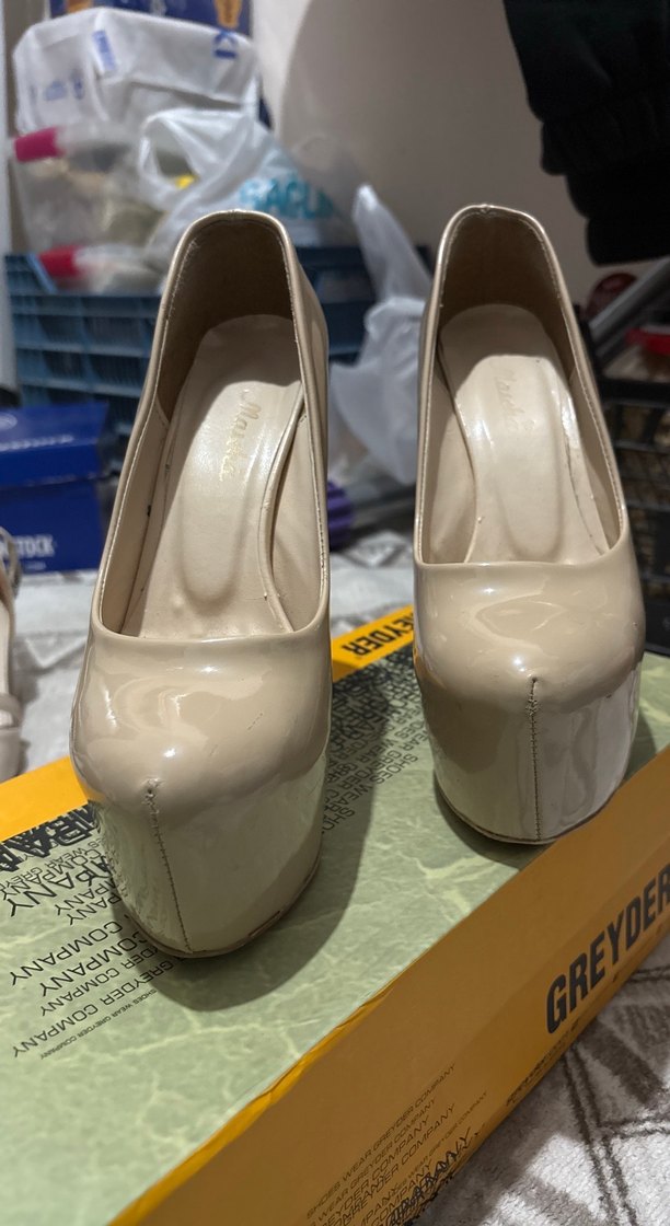 Düz bej rugan platform topuklu stiletto, günlük kullanıma uygun zahmetsiz şıklık sunar. Sadece bir defa kullanıldı