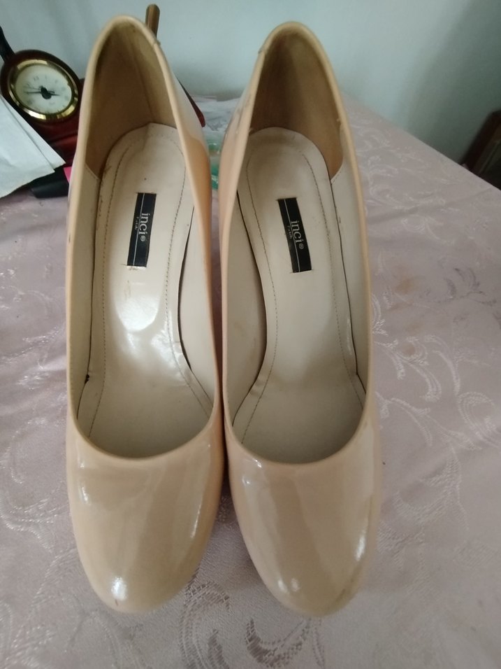Ofis kullanımı için uygun, rugan görünümlü bej stiletto topuklu kadın ayakkabısı. Minimalist ve desensiz, modern klasik tarzda. fotoğraf ta göründüğü gibi dir ufak bir fiziği var