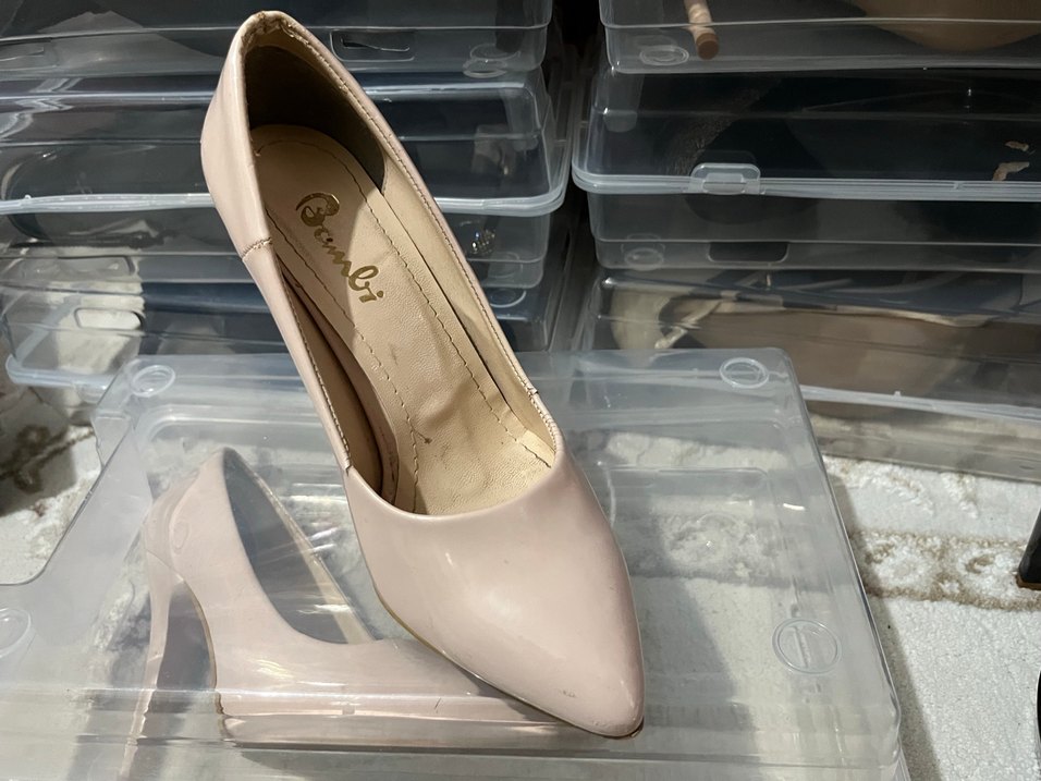 Bej renkli, rugan görünümlü, klasik sivri burunlu ve lastik malzemeden yapılmış topuklu kadın ayakkabısı. Ofis için uygun şık tasarım.