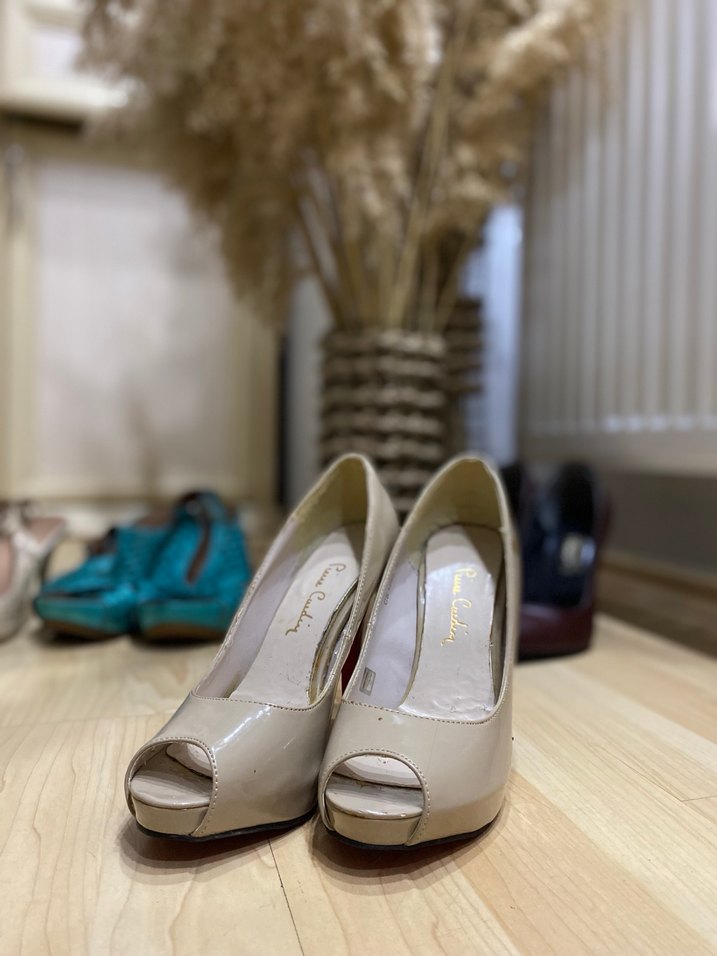 Bej stiletto topuklu ayakkabılar, şık ve çağdaş tasarımıyla günlük klasik şıklık sunar. Zarif ve desensiz yapısıyla rahat bir kullanım sağlar. Normalde 36 numaradır ancak ayağa uyması için kalıp kullanıldı.