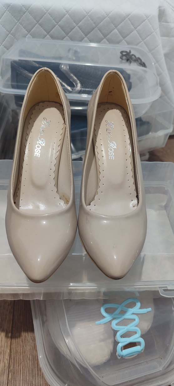 Ofis için uygun, modern klasik tarzda parlak bej stiletto topuklu ayakkabı. Lastik malzemeden, desensiz ve pürüzsüz yüzeye sahip.hiç kullanılmadı. sıfır ürün