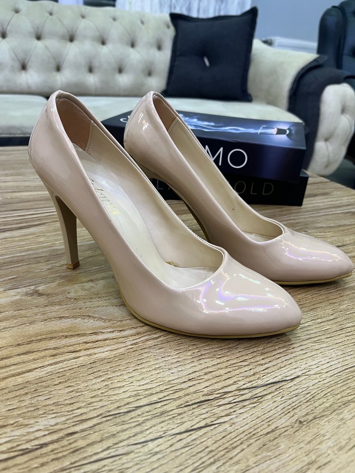 Bej rugan malzemeden yapılmış, sivri burunlu ve ince topuklu stiletto ayakkabılar. Ofis için modern klasik tarzda, rahat kauçuk tabanlı ve zahmetsiz şıklık sunar.