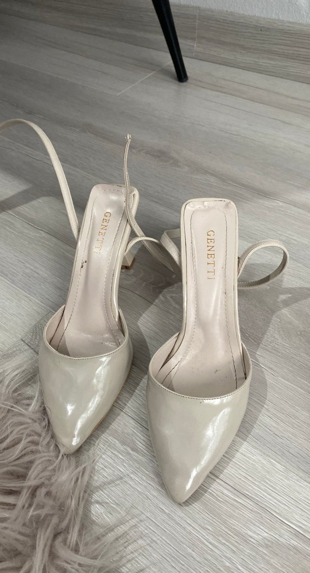 Bej renkte, tokalı bantlı stiletto topuklu ayakkabı. Modern klasik tarzda, düğünler için uygun, rugan görünümlü ve desensiz. Marka: GENETTI.