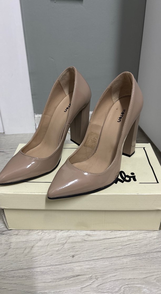Bej renkte, rugan malzemeden yapılmış, sivri burunlu stiletto topuklu kadın ayakkabısı. Ofis için modern klasik stili ve rahat kauçuk taban sunar.