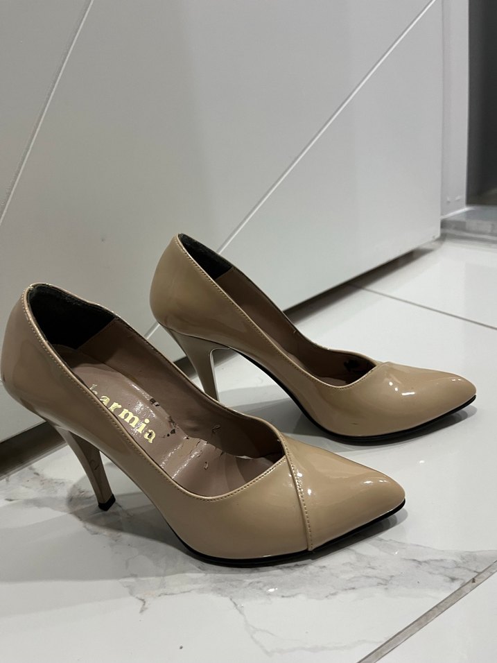 Modern klasik tasarıma sahip bej rugan stiletto topuklu ayakkabı, pürüzsüz kauçuk malzemeden üretilmiştir. Ofis için şık ve zahmetsiz bir görünüm sağlar.