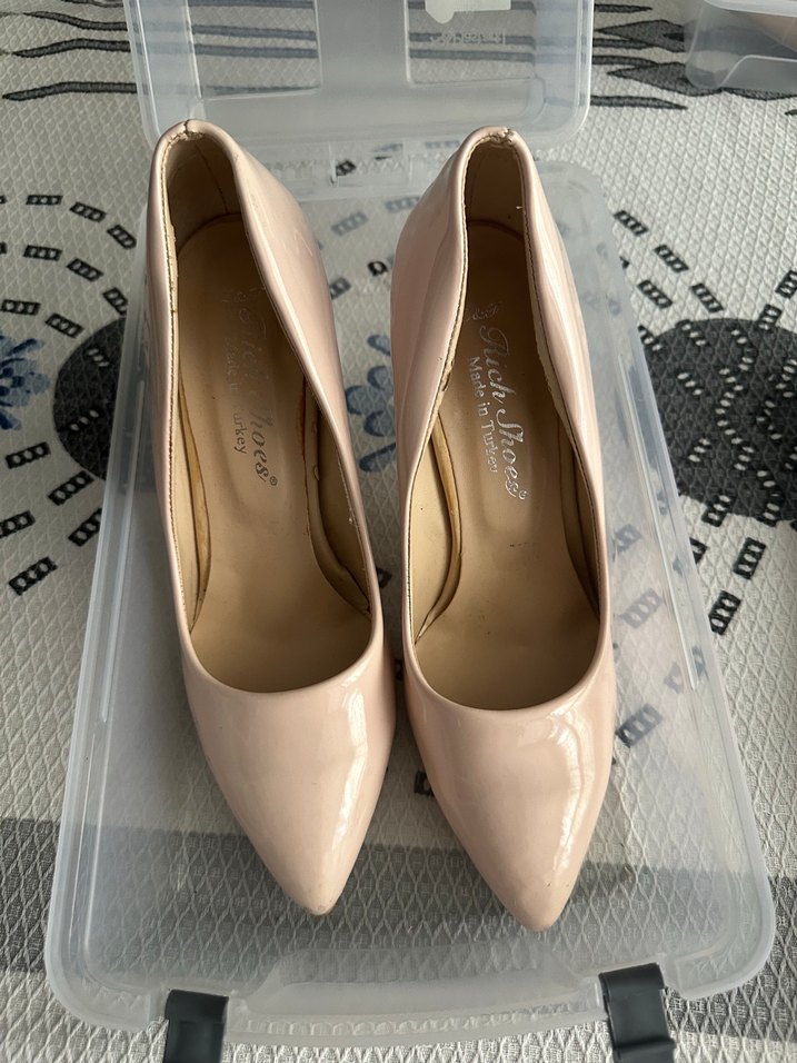 Bej rugan stiletto topuklu ayakkabılar, modern klasik bir görünüm sunar. Kauçuk malzemeden yapılmış olup ofis şıklığı için zahmetsiz bir şıklık sağlar.