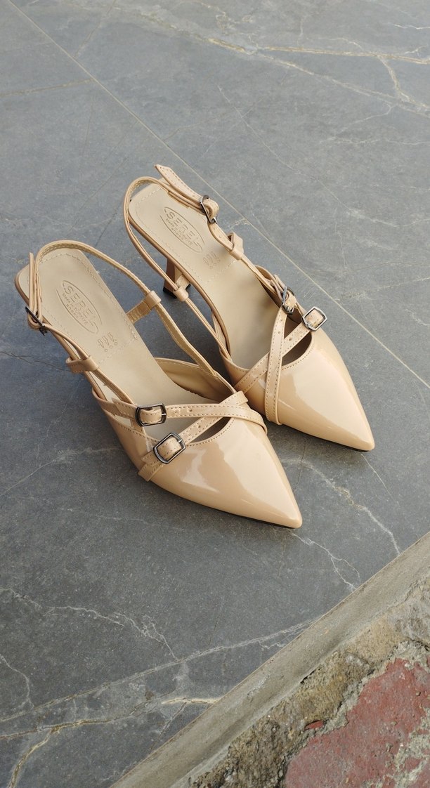 Bej renkte, rugan görünümlü tokalı stiletto topuklu kadın ayakkabı. Minimalist ve çağdaş tasarımda, klasik şıklığa uygun.