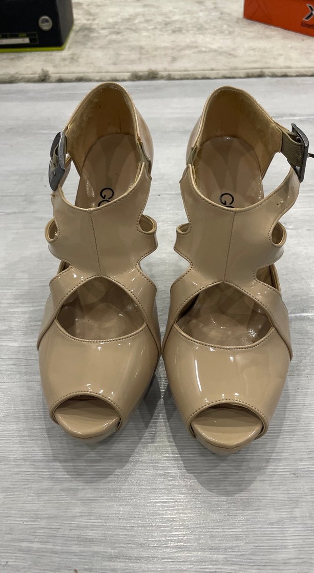 Bej rugan malzemeden yapılmış, tokalı ve yılan deseni detaylı kadın platform stiletto topuklu ayakkabı, hiç giyilmedi hiçbir sıkıntısı yoktur