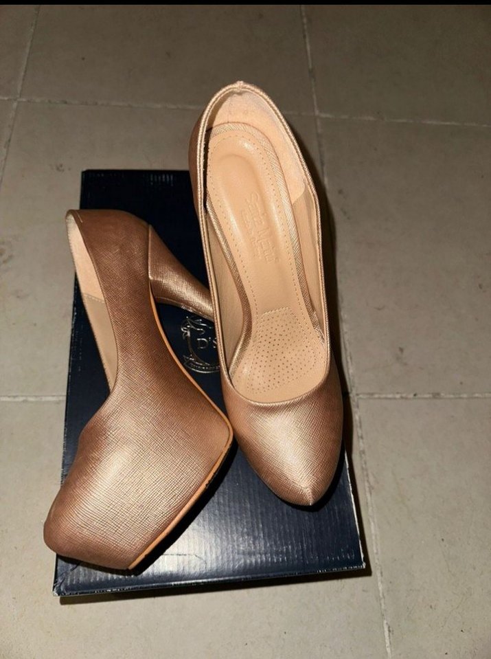 Bej parlak kauçuk malzemeden yapılmış, tokalı klasik stilettolar, günlük kullanım için uygun.