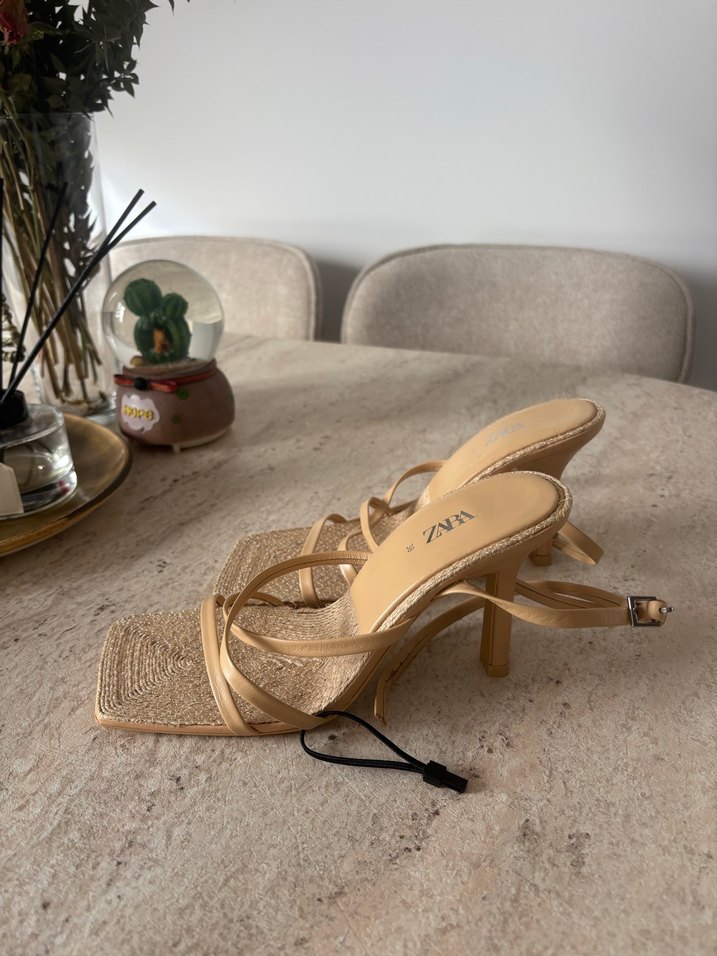 Bej yılan desenli parmak arası, ince topuklu ve tokalı sandalet, minimalist ve bohem tarzıyla romantik akşamlar için uygun. ✨