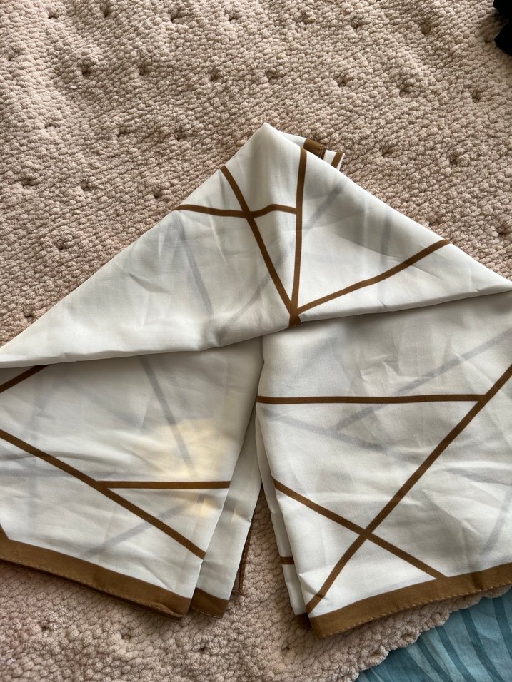 Bej renkli, parlak sentetik kumaştan yapılmış, drapeli geometrik desenli kadın şal