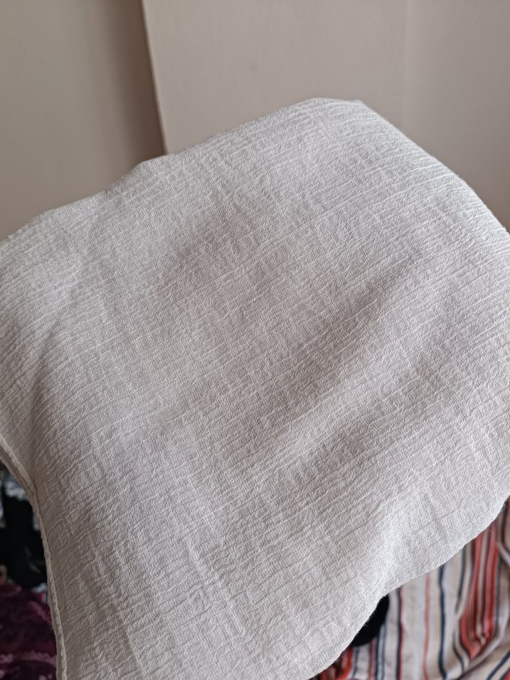 Yumuşak keten kumaştan yapılmış, bej renkli pilili kadın şalı. Rahat ve bohem tarzda, sade ve temel görünüme uygun.
