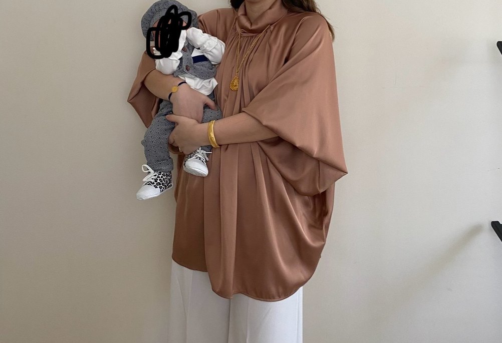 Bej renkli, salaş kesim, kısa kollu hamile tunik. Yüksek yakalı, ipeksi dokulu ve drapeli tasarıma sahip midi boyda rahat bir modeldir. Bir kere Mevlüt’te giyindim