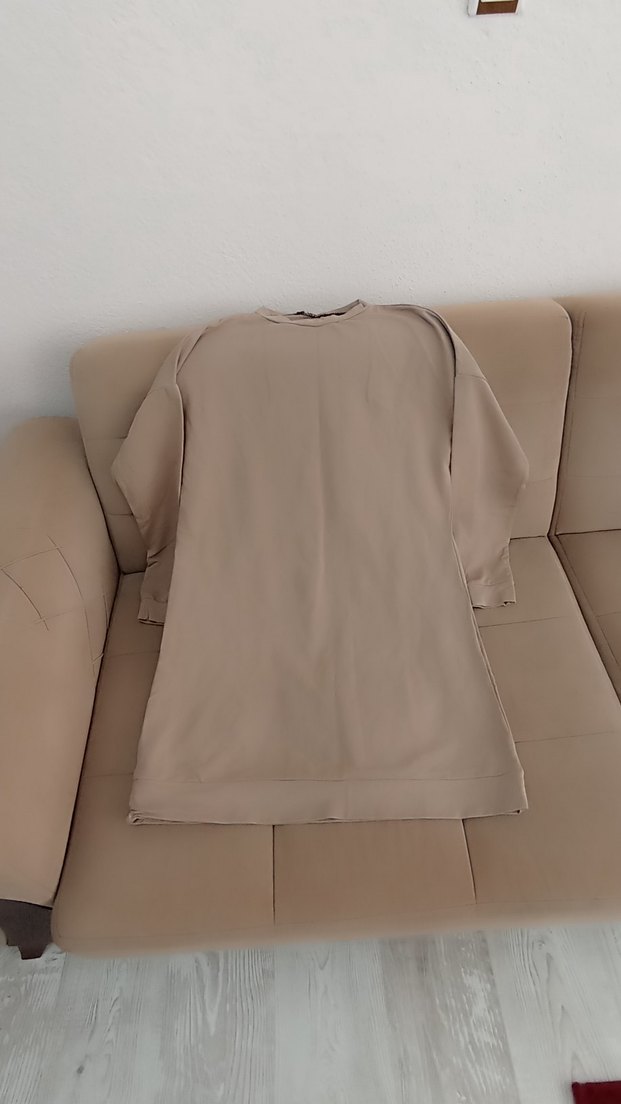Bej renkli, salaş kesim, kısa kollu hamile tunik. Yumuşak sentetik kumaştan üretilmiş, desen içermeyen minimalist tasarıma sahiptir. Midi boy rahatlık sağlar.