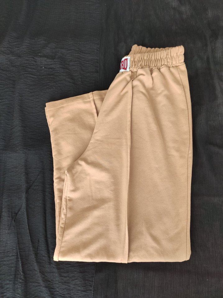 Bej renkli, salaş kesim kadın kumaş pantolon. Rahatlık için elastik bel bandı bulunur, yumuşak ve sıcak dokuludur. Günlük athleisure stiline uygundur.