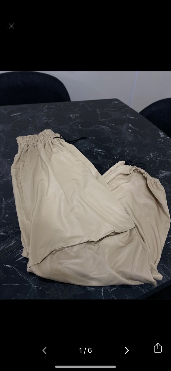 Bej renginde, salaş kesim, drapeli ve lastikli kadın kumaş pantolon, günlük rahat kullanım için uygundur.