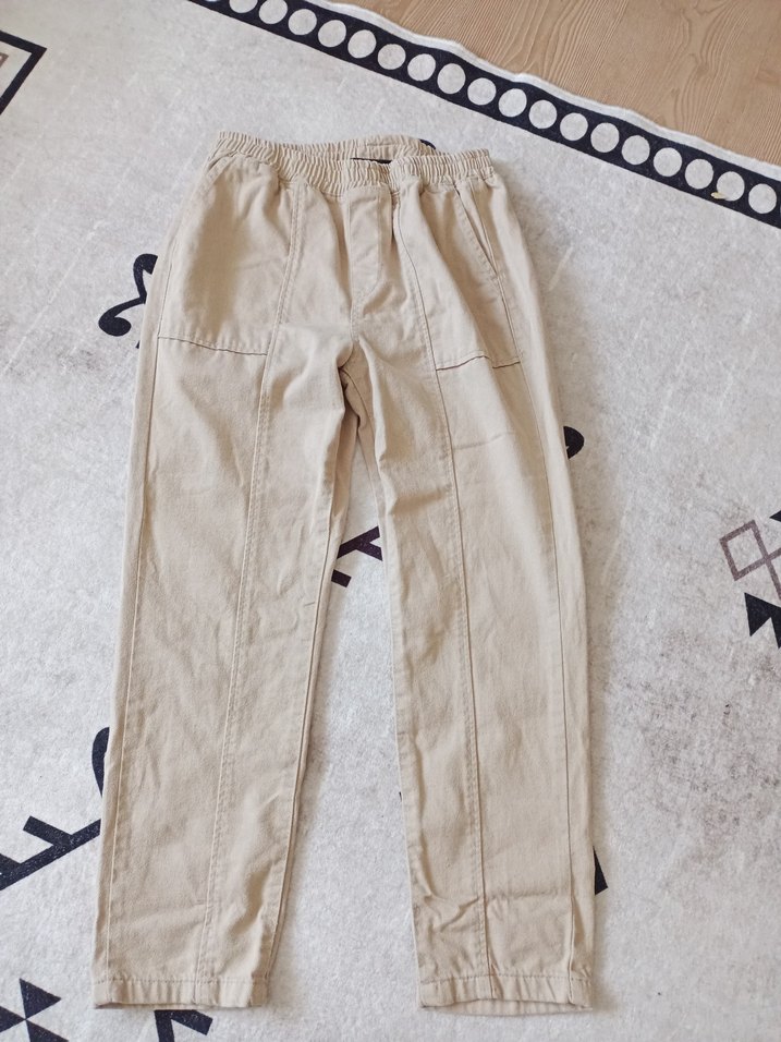 erkekiçin bej keten kumaştan, salaş kesim ve lastikli bel detaylı pantolon. Rahat ve pastel tonlarda, şık ve rahat bir görünüm sunar.